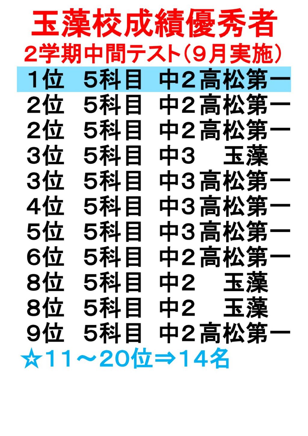 2学期中間テスト成績優秀者速報! / 中学生