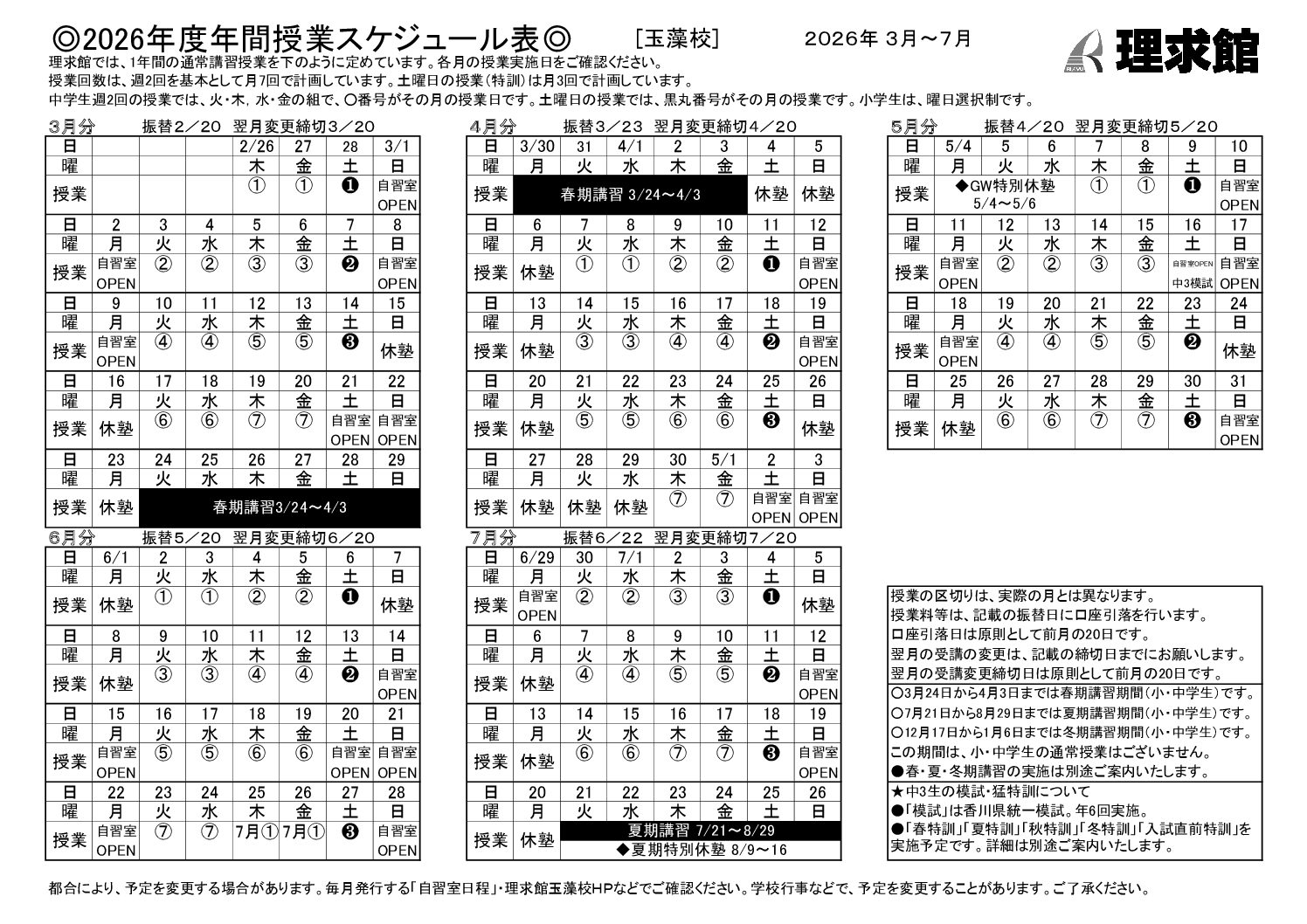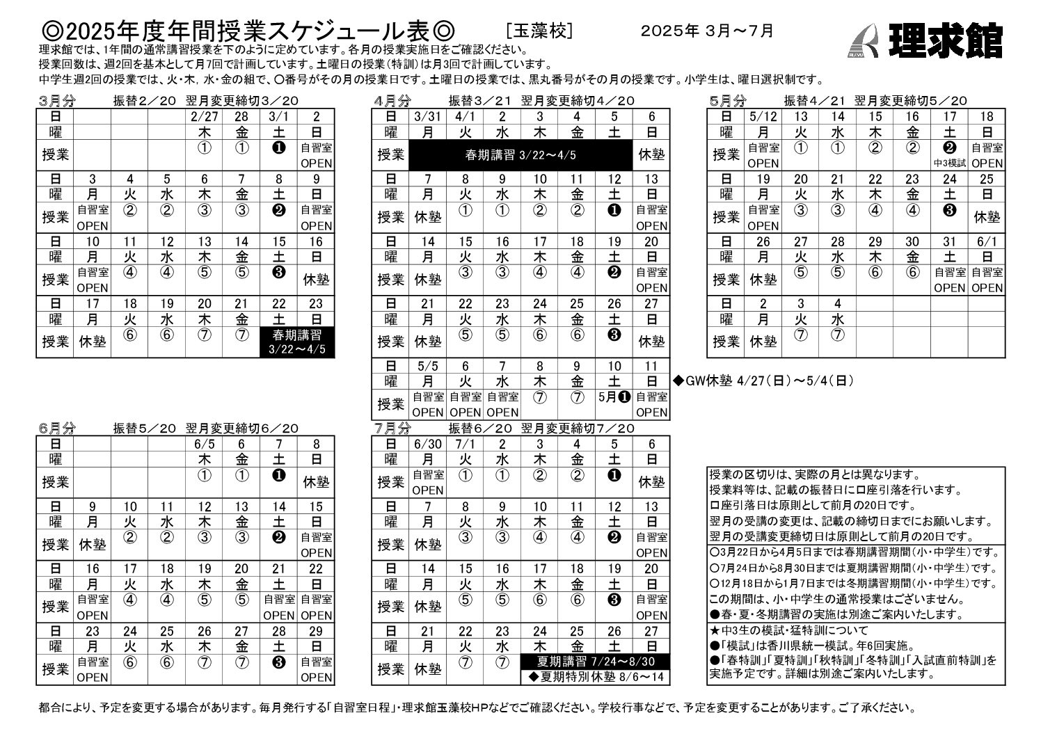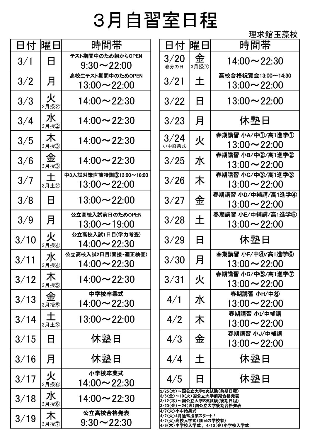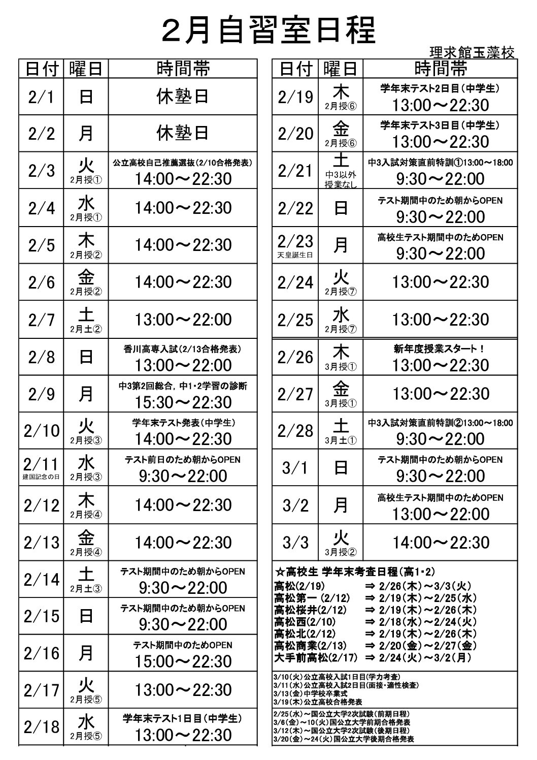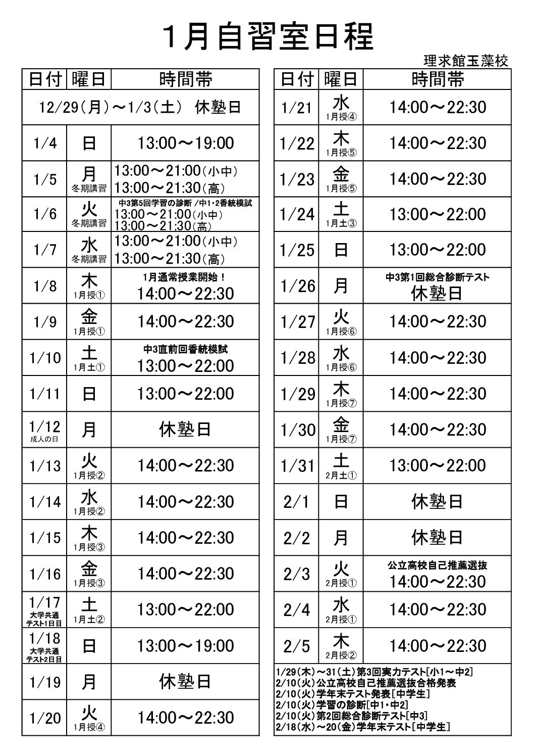 自習室日程・授業スケジュール